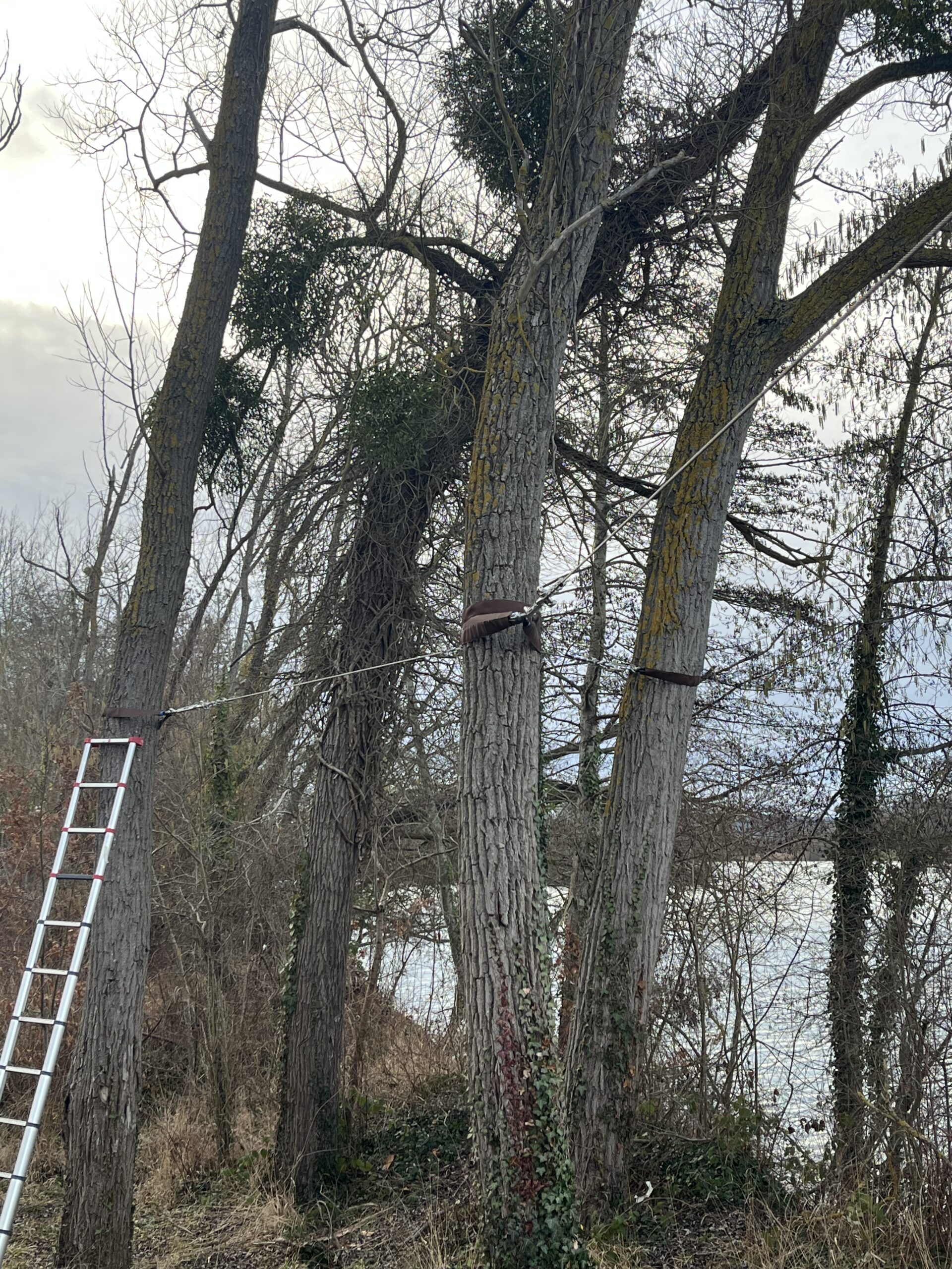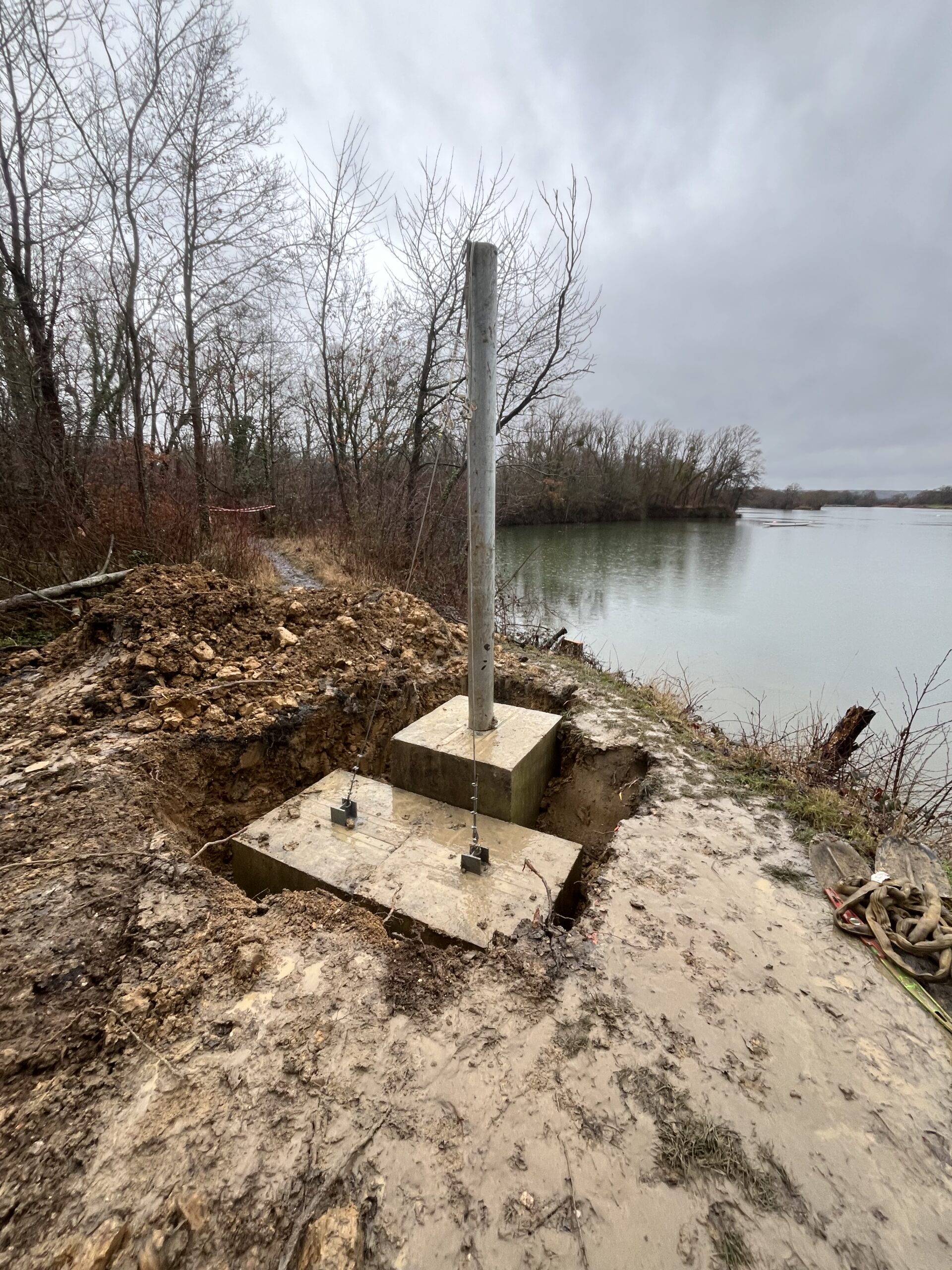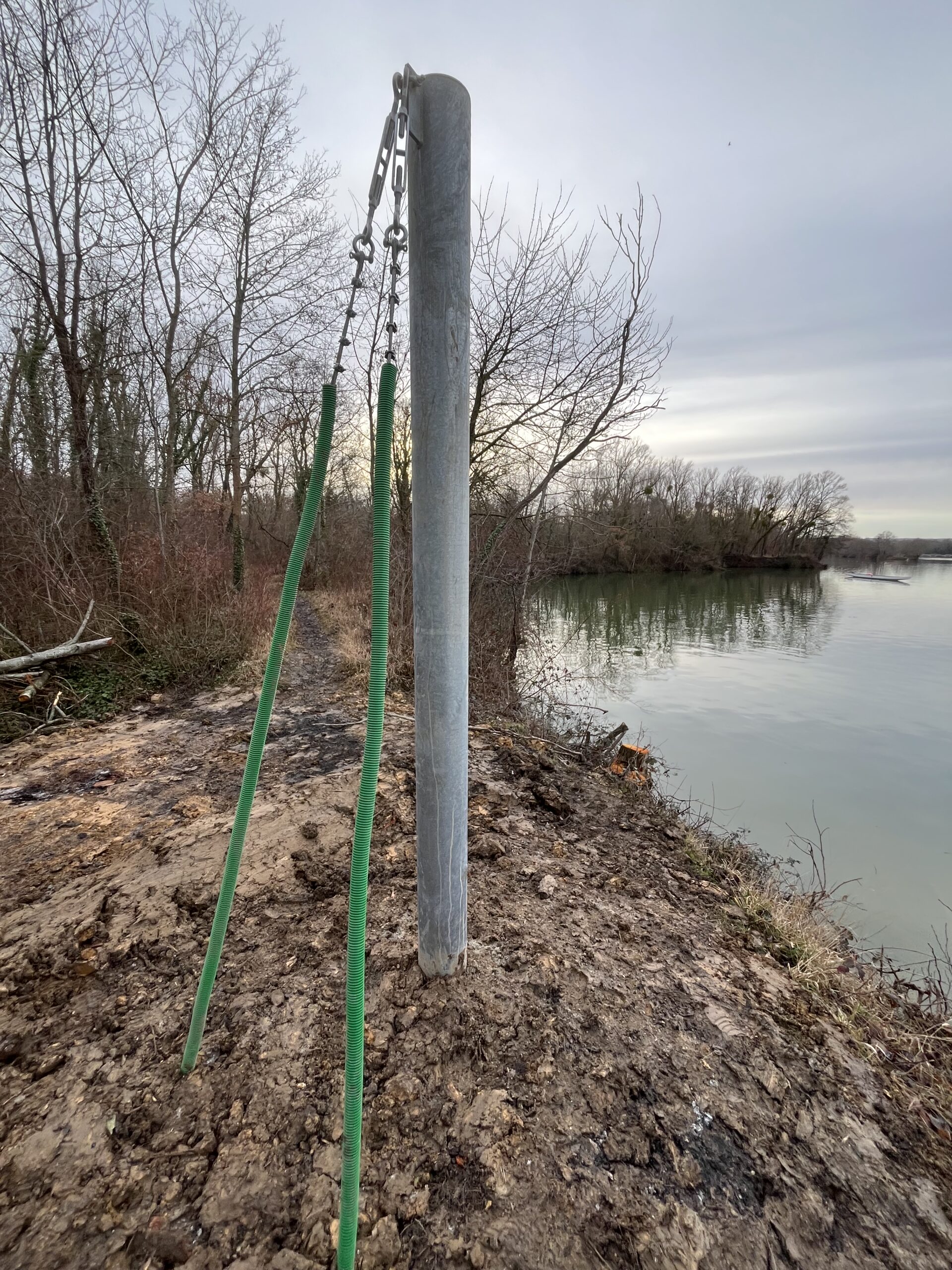 Cet ensemble auto porté installé sur un poteau acier de 3,2 mètres de haut sur massifs bétons inutilisés et récupérés sur le site d’un côté et un système d’ancrage dans les arbres avec haubanage de l’autre a permis l’installation de 12 câblettes transversales et 24 portes de slalom.