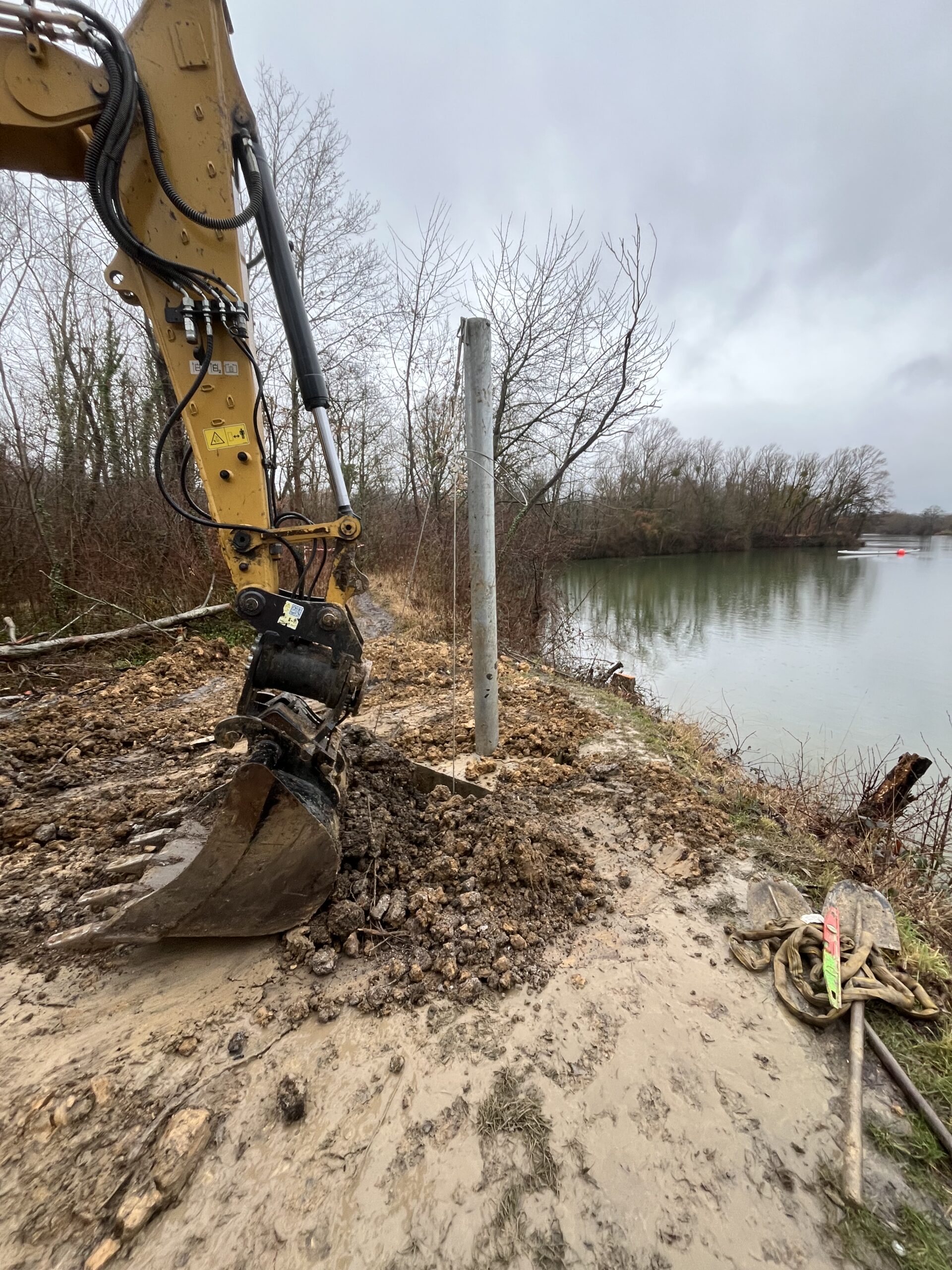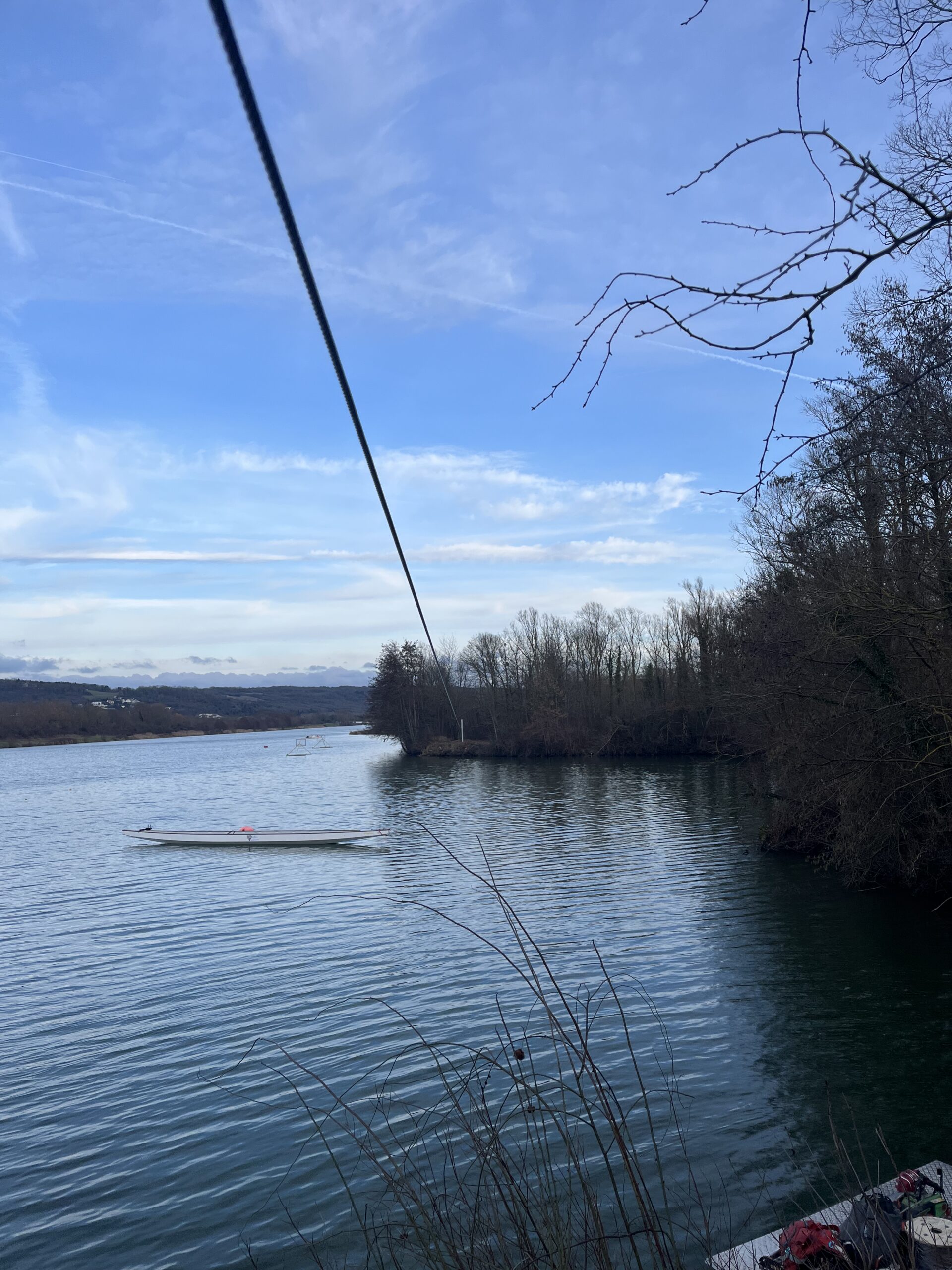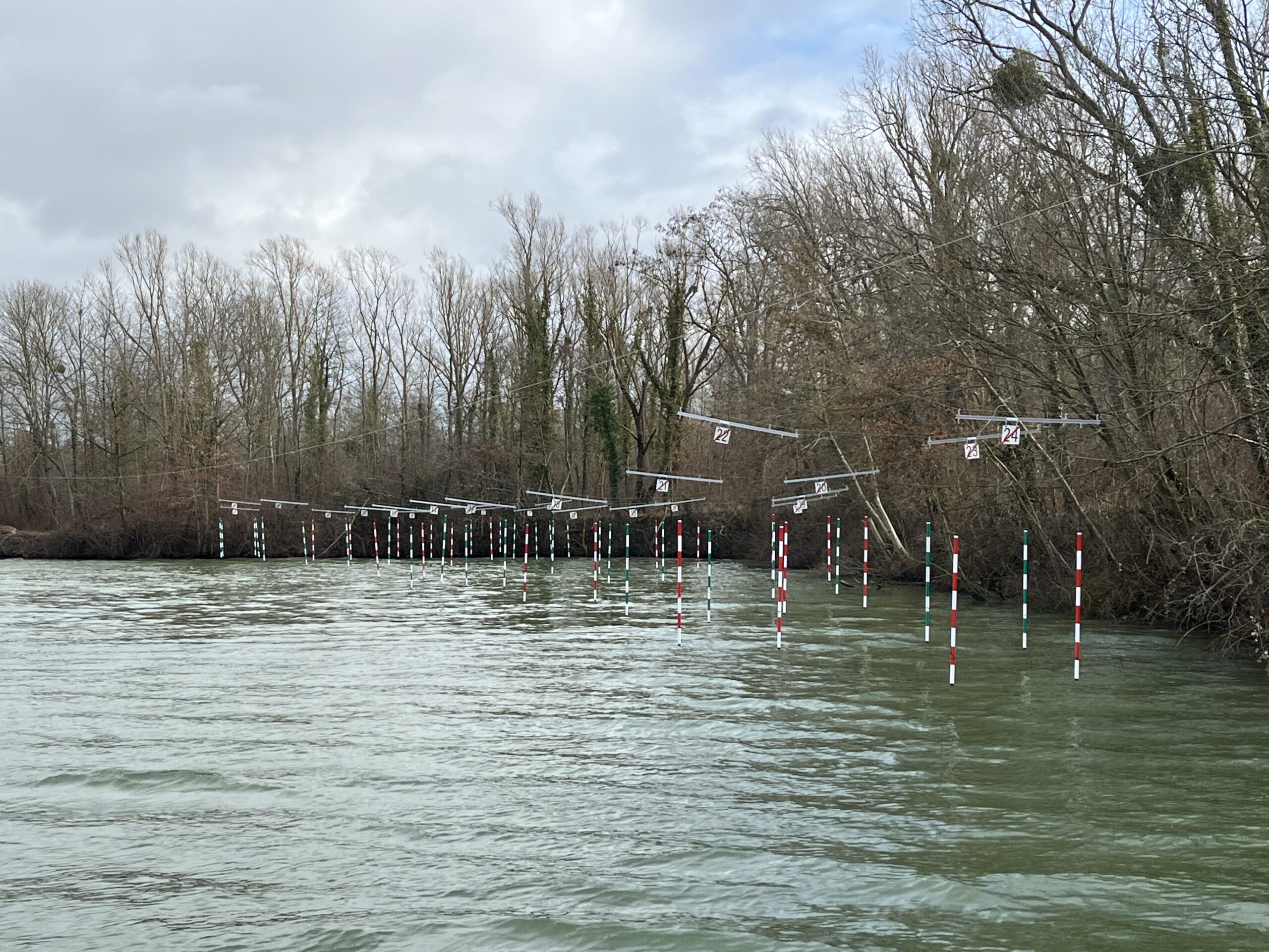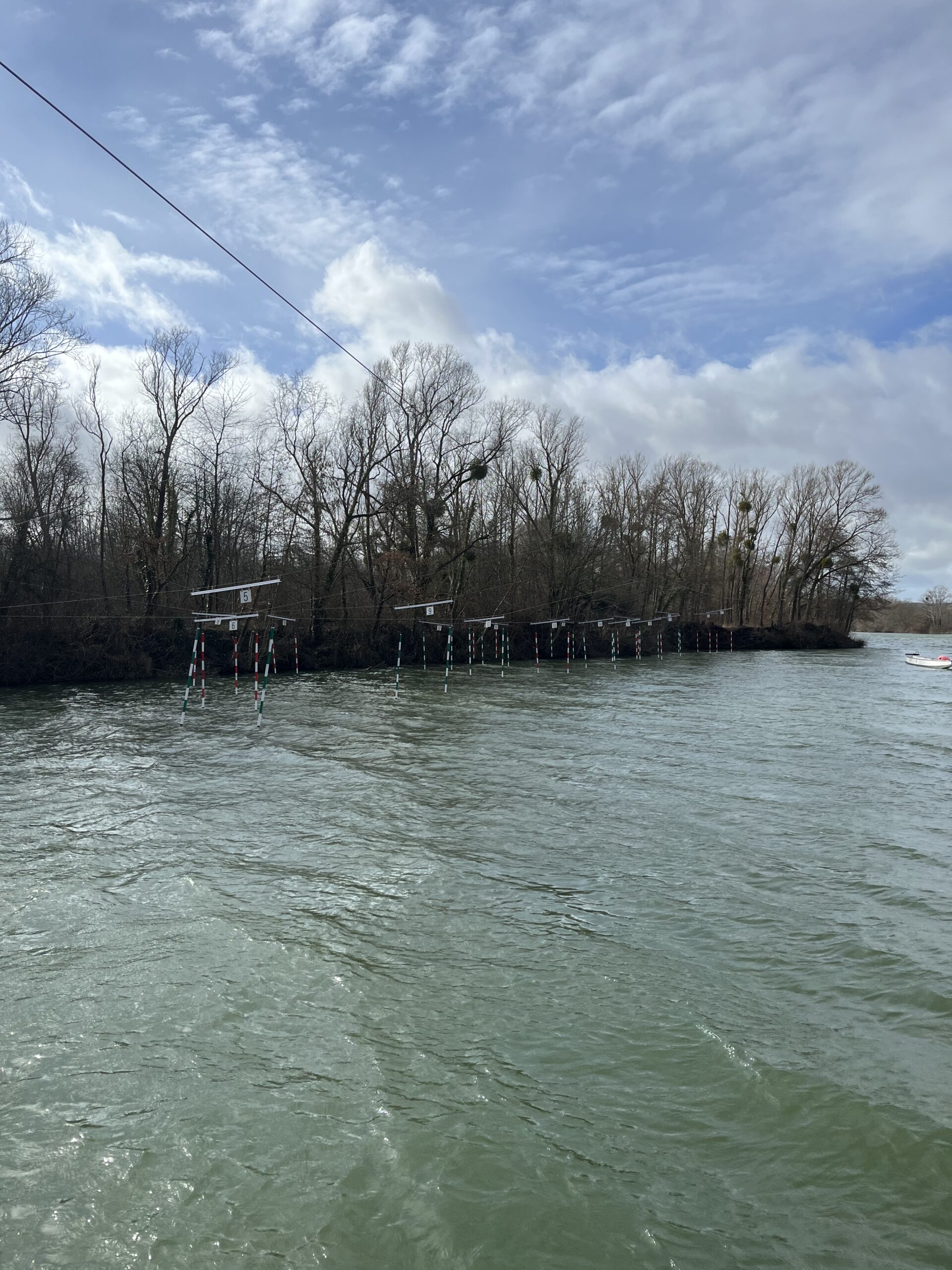 Implanté dans une petite anse du plan d’eau afin de ne pas gêner le passage des avirons et kayaks de vitesse, il aura fallu faire preuve d’ingéniosité confortée par de nombreuses notes de calculs pour tendre un câble d’une portée de 115 mètres supportant les câbles transversaux et portes de slalom.